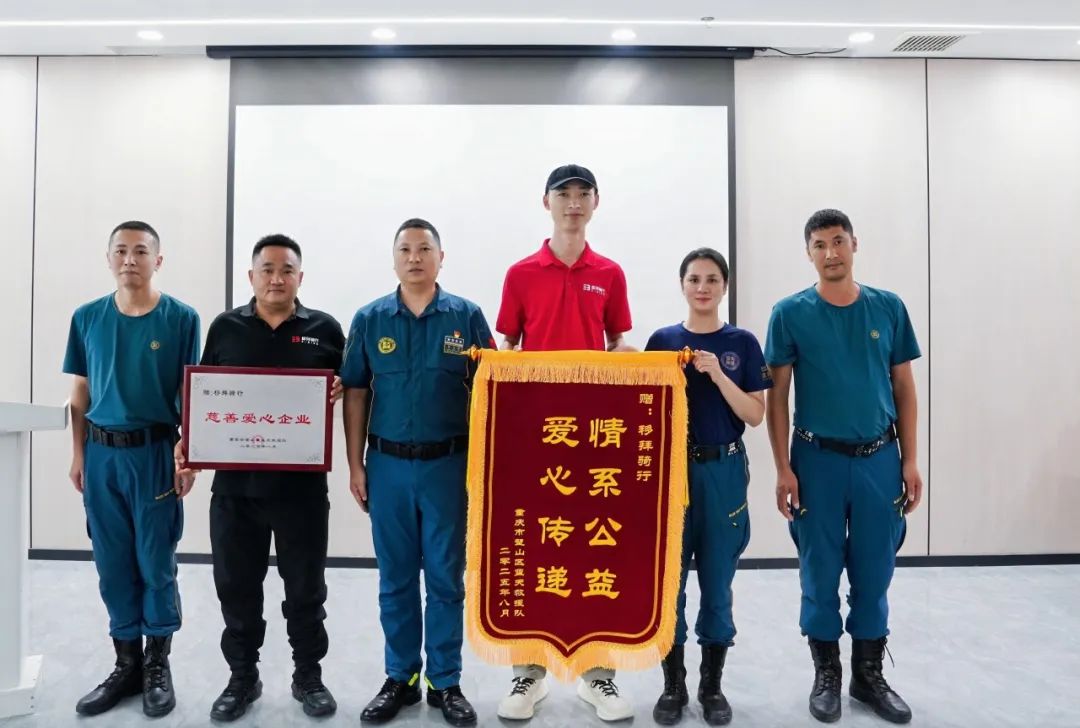 为了表达对移拜骑行公益行为的高度肯定,重庆璧山区蓝天救援队现场授予移拜骑行“慈善爱心企业”荣誉牌匾和“情系公益 爱心传递”锦旗,这份荣誉象征着双方在公益道路上的携手同行与共同担当。